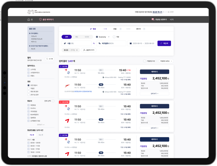 출장 관리자는 예약 및 발권 내역을 실시간 확인하며 이를 통해 효율적인 출장 모니터링이 가능합니다.